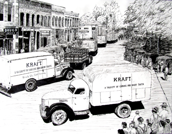 Matted, wrapped, signed 8 x 10 print on fine art paper, your choice of white or cream. Depiction of a parade which took place in Bentonville, Arkansas in 1947.